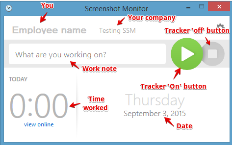 After signing in to SSM for the first time, the app will look like the above screenshot. Clicking on the green button would start tracking your time with screenshots (by default). There is a ‘Stop’ button as well.